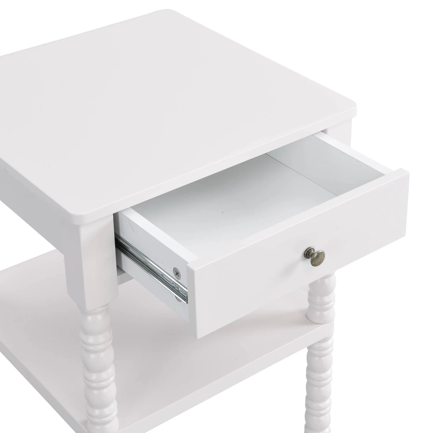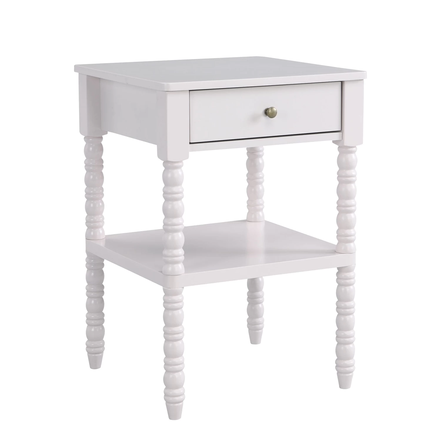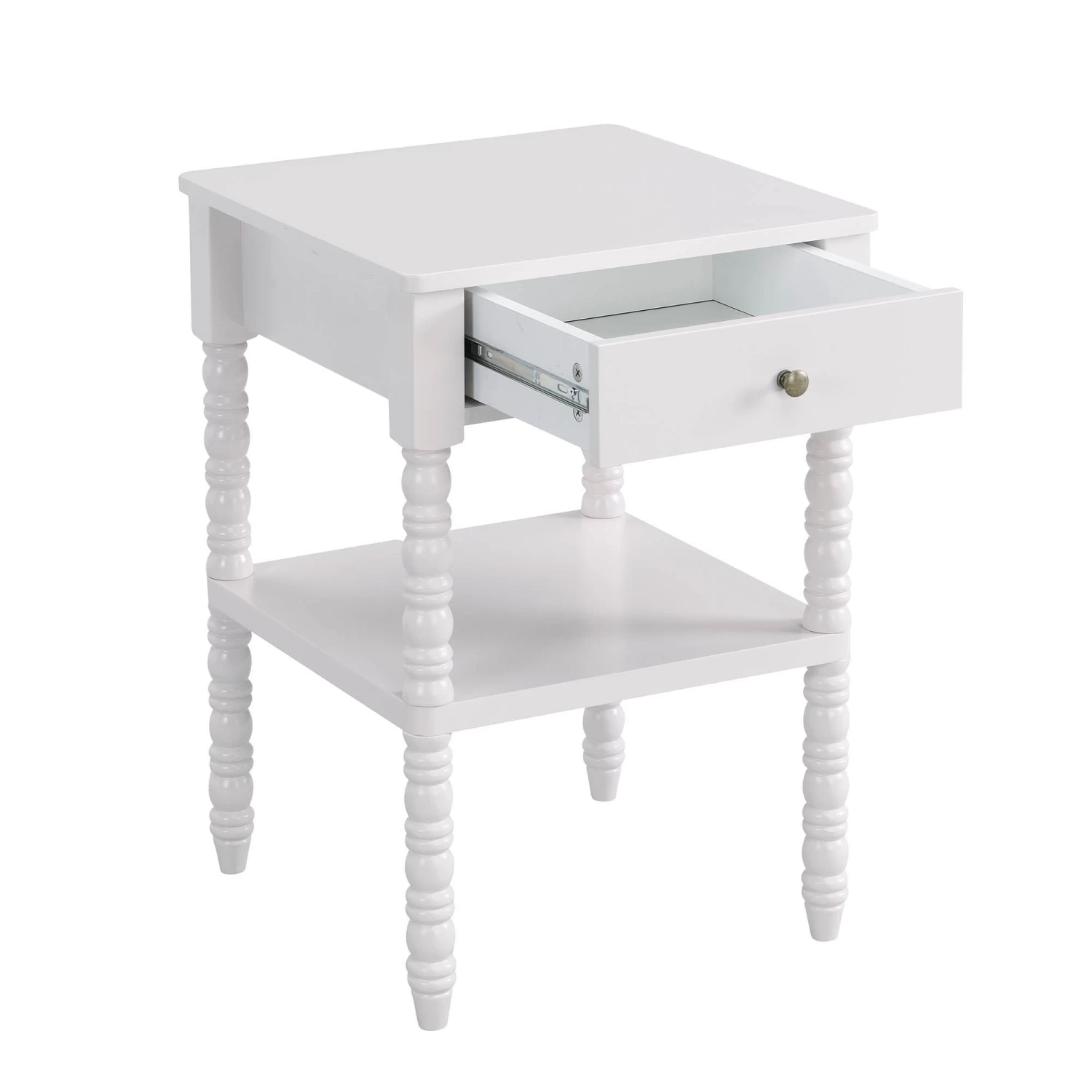 - Our Aldwinke side table features lathe-turned ornamental legs coordinated with antique brass look drawer handles for an impressive look.