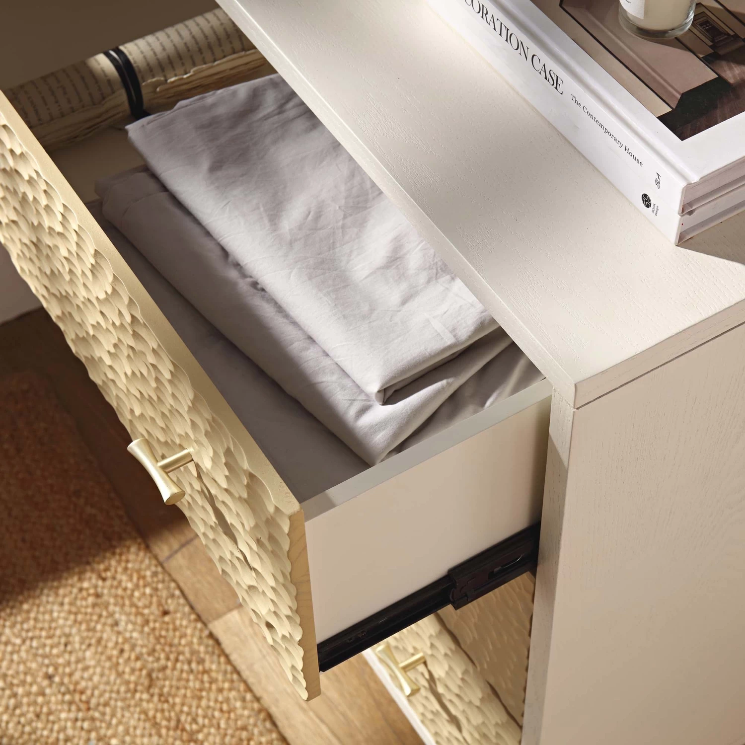 - Boasting modern classic appeal, the cabinet features chip carved drawer fronts in sand beige colour with ivory frame, ideal for neutral tone decor.