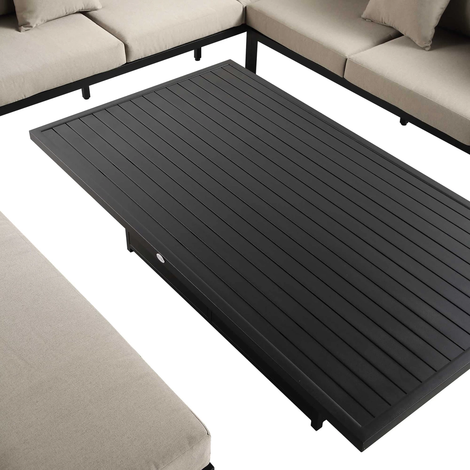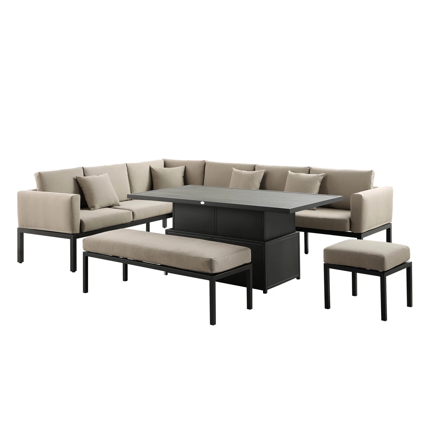 - Comprising of a solid aluminium frame and sumptuous back and seat cushions for added comfort and support, our Calabasas Large Outdoor Fabric and Aluminium Corner Casual Dining Set is perfect for outdoor gatherings