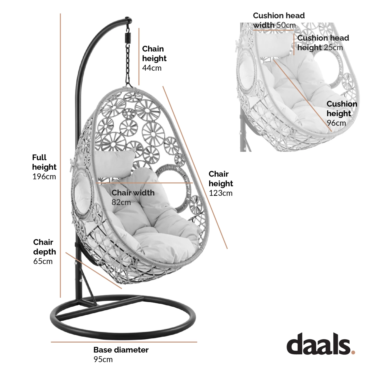 - Our Daisy hanging chair is made with durable beige faux rattan hand woven in beautiful flower shaped patterns.