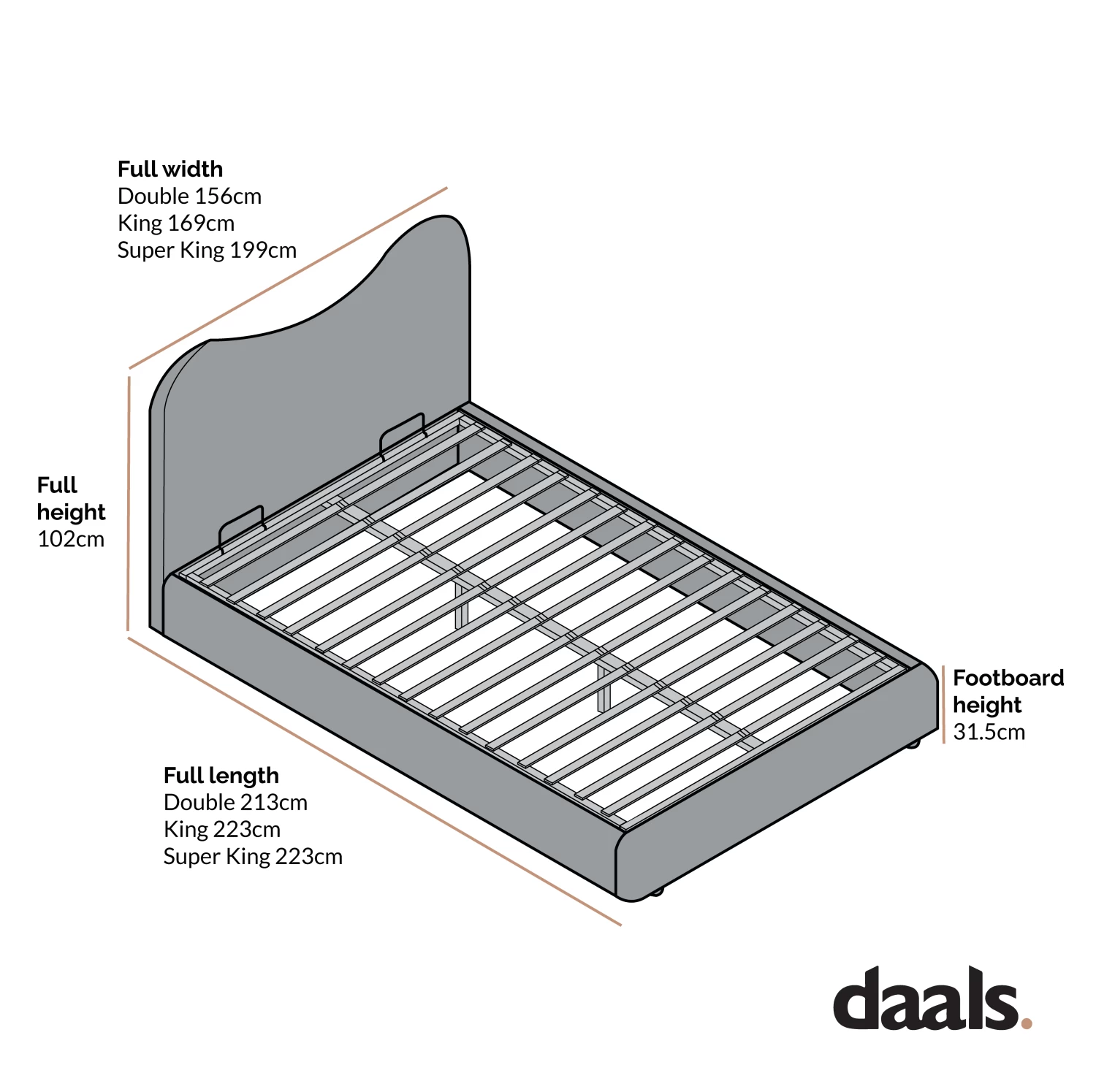 - 4FT6 Double: W 156 x D 213 x H 102 cm