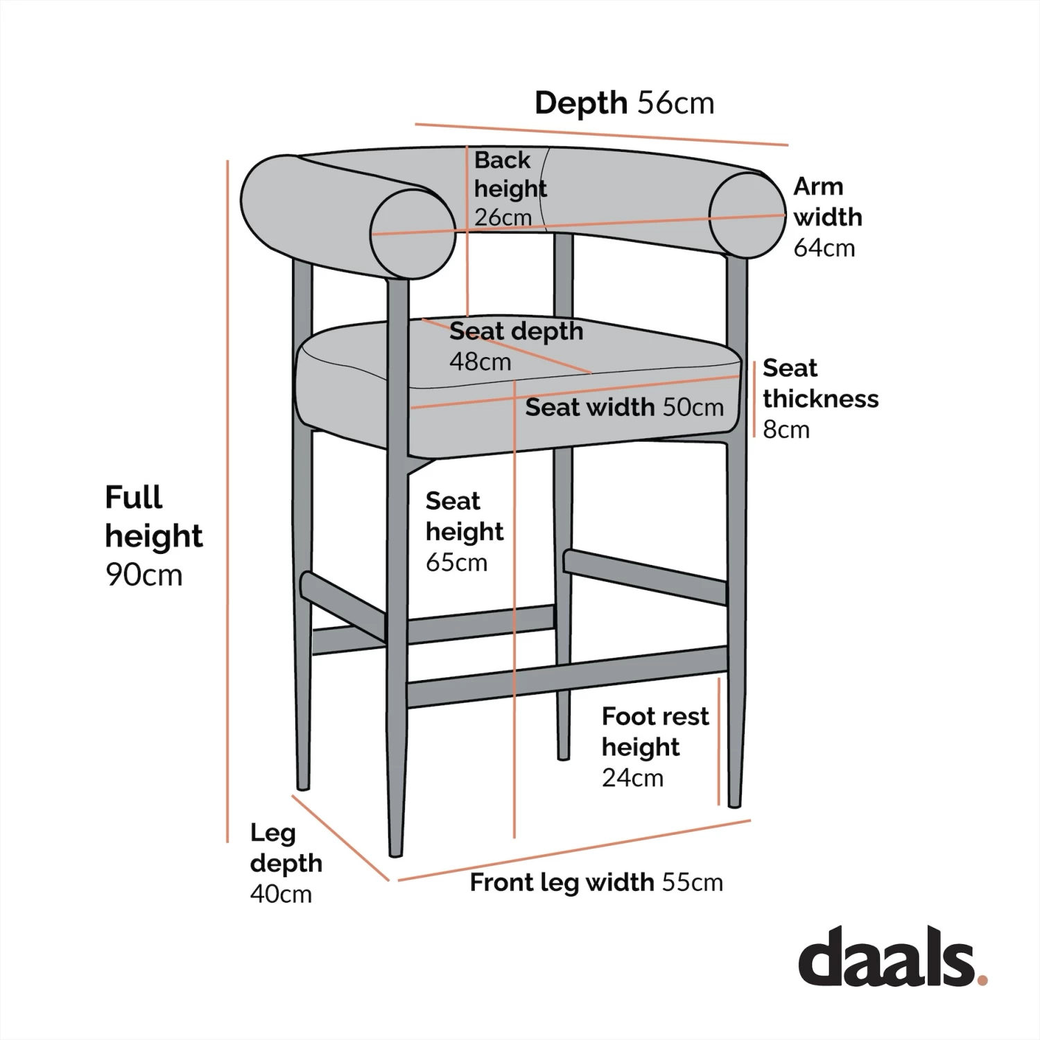 - Size: W 65 x D 56 x H 90 cm. Seat height:Â 65 cm.
