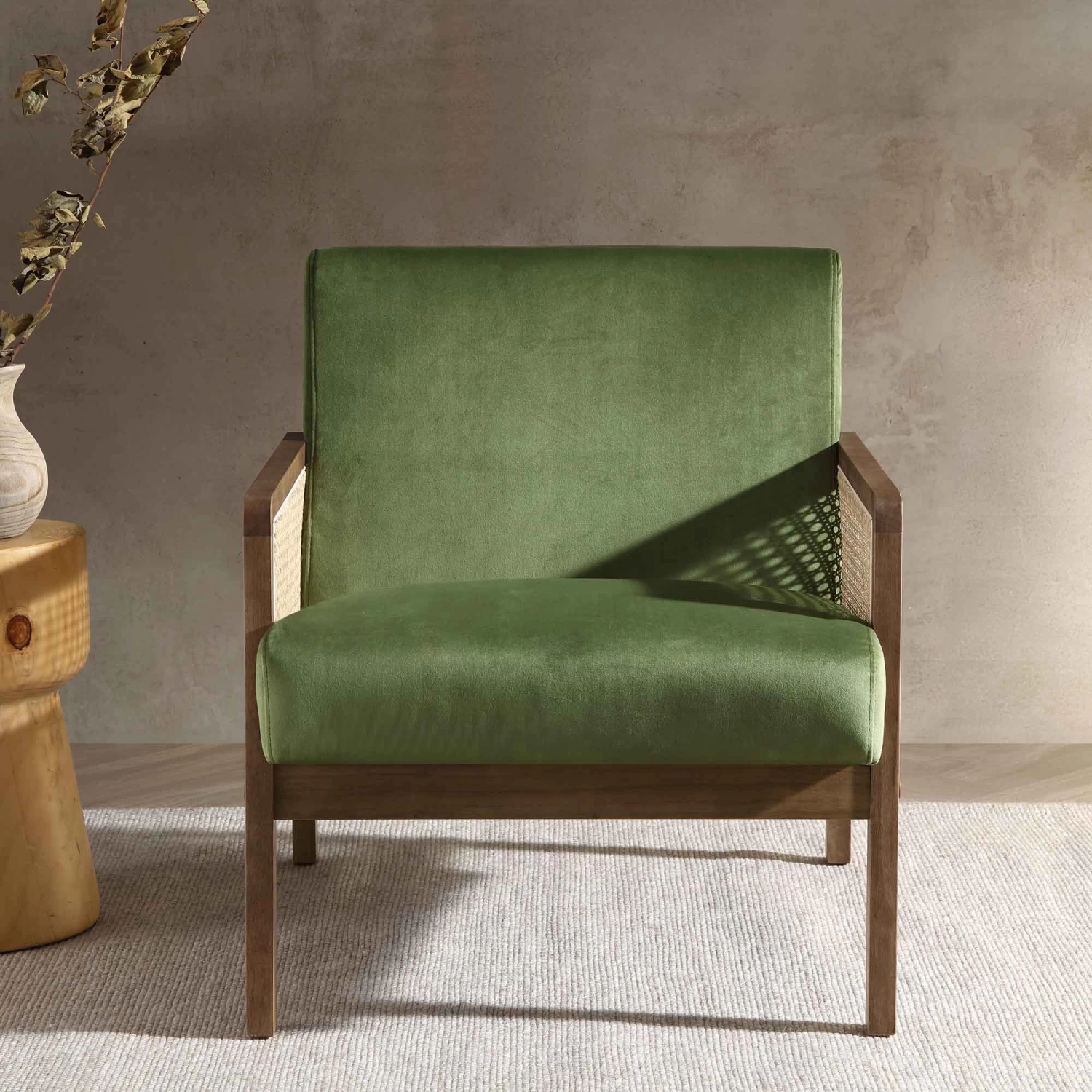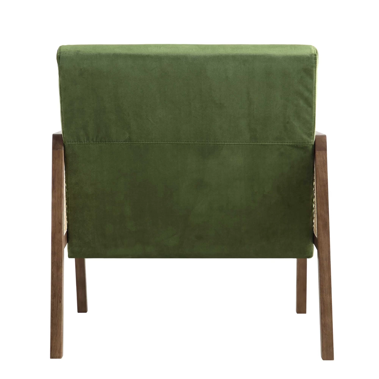 - Crafted from solid wood, the chair frame has been stained in walnut shade, which is completed with natural rattan cane cut out detailing on both armrests.