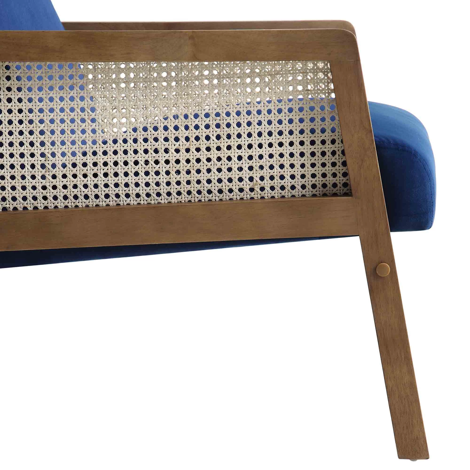 - Complete the look:Â Pictured with Fyne Navy Blue Velvet and Rattan Armchair is our versatile Pollie Navy Velvet Storage Stool.
