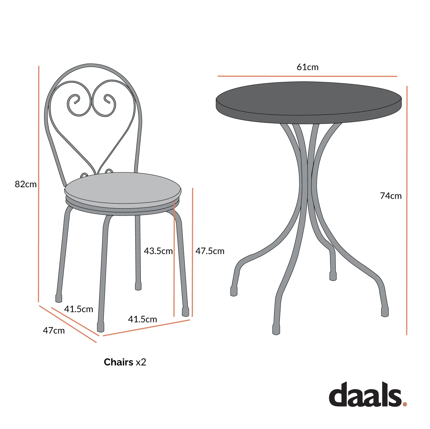 - The Haymes Bistro Set encapsulates a scrolled metalwork design on the chairs and an arched design on the coffee table, perfectly combining style with a classic design.