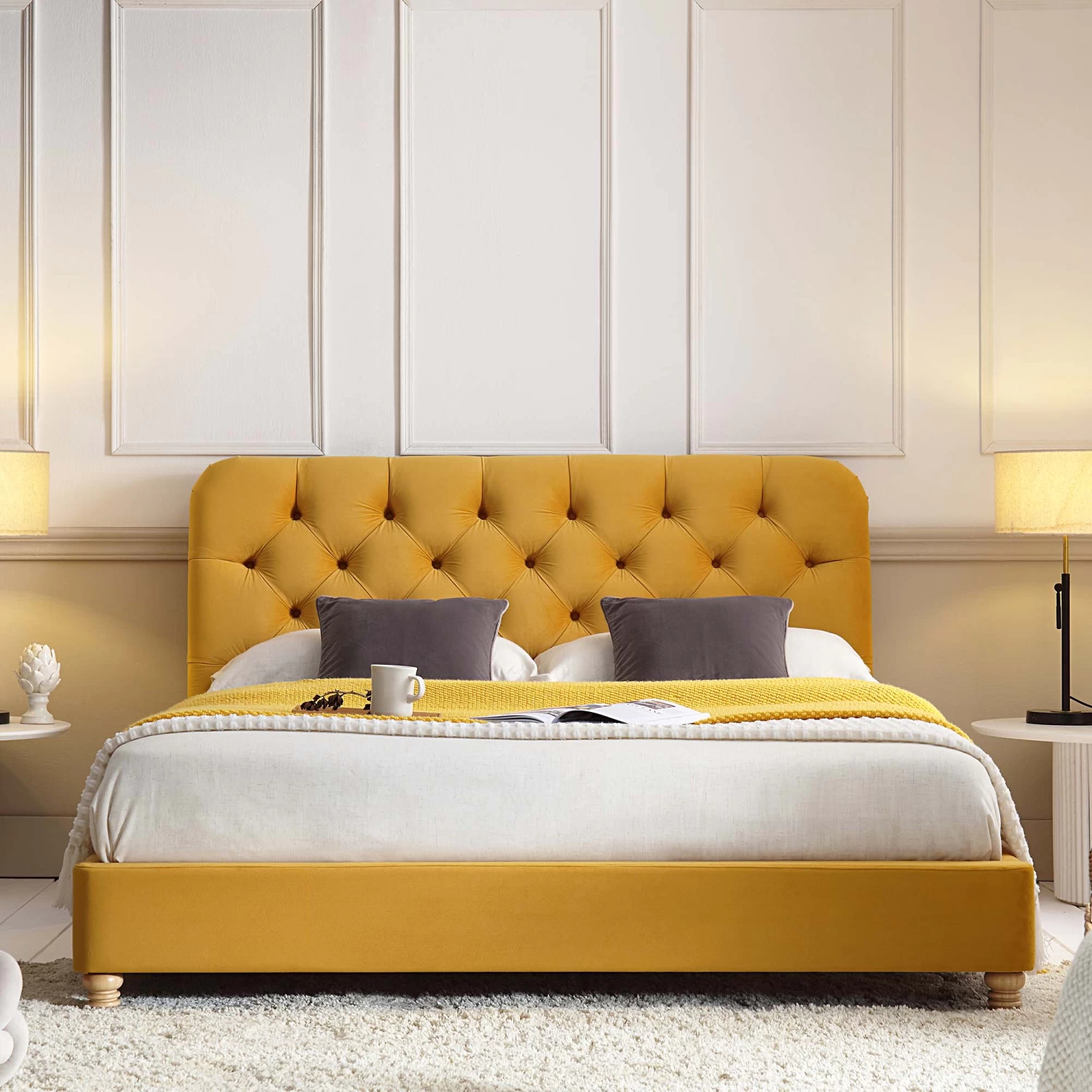 - The bed is upholstered with sumptuous velvet touch fabric in rich yellow fabric.