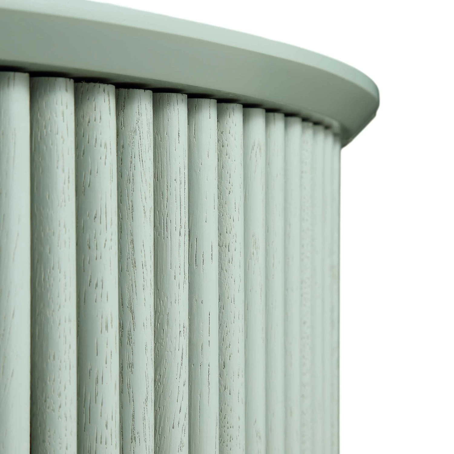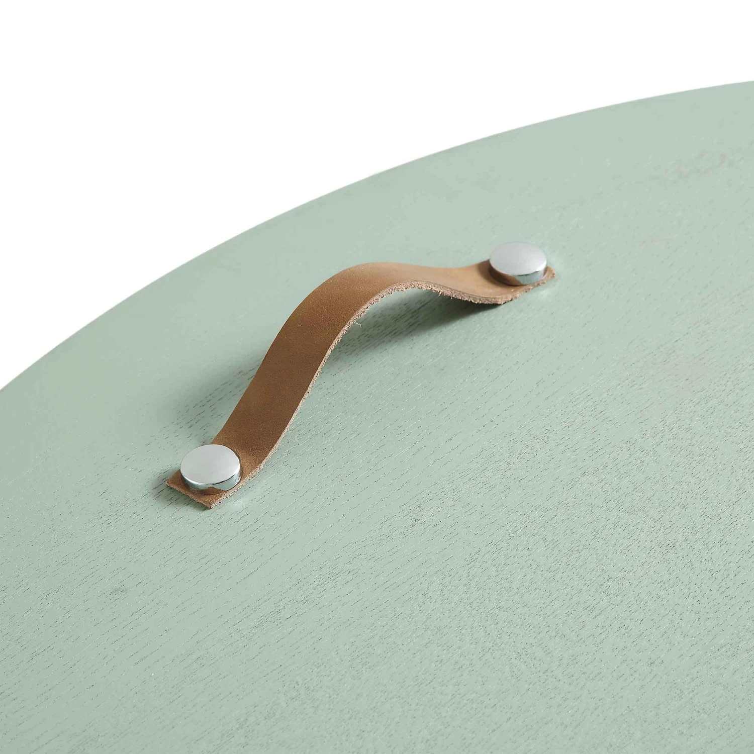 - Crafted from solid and and oak veneer and finished with sage green paint, each table has its unique natural grains and knots.