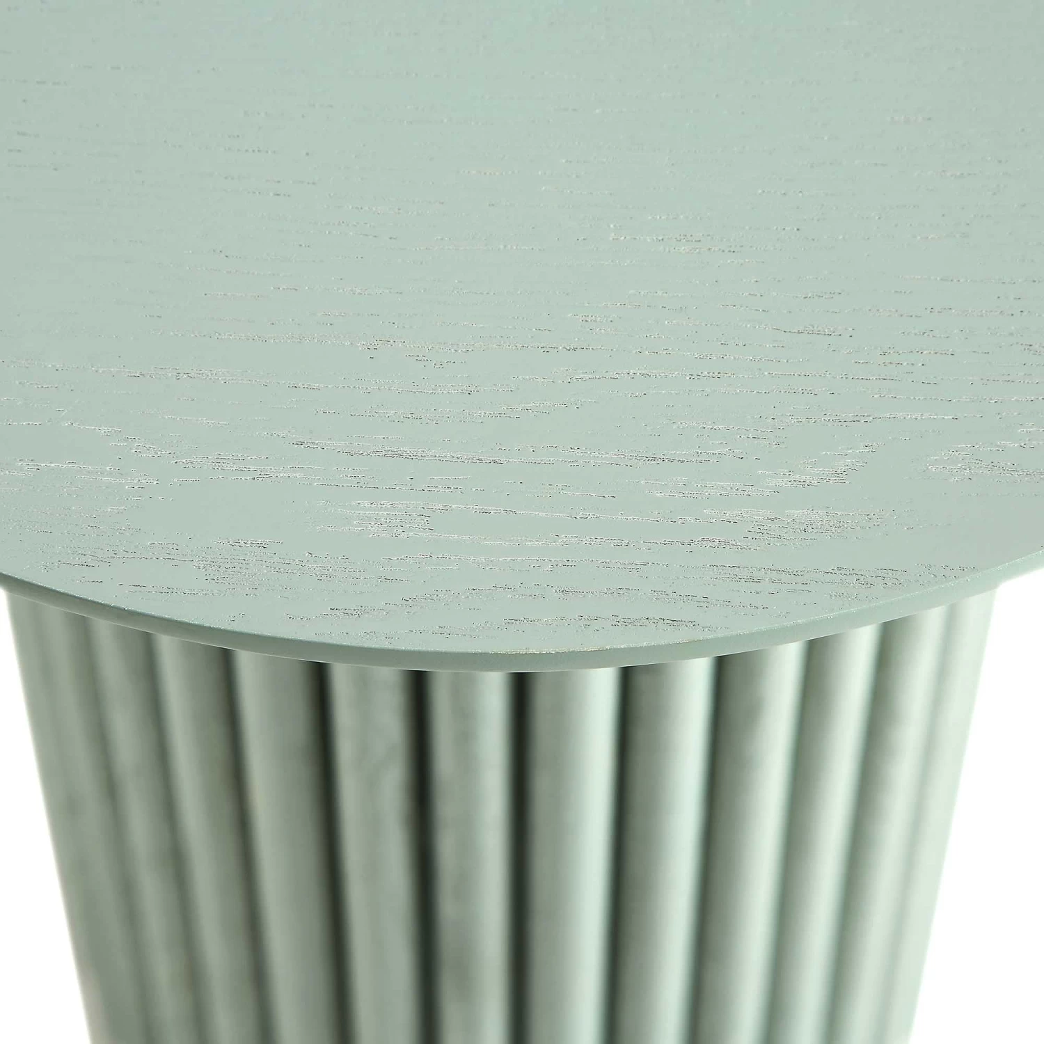 - Crafted from solid and and oak veneer and finished with sage green paint, each table has its unique natural grains and knots.