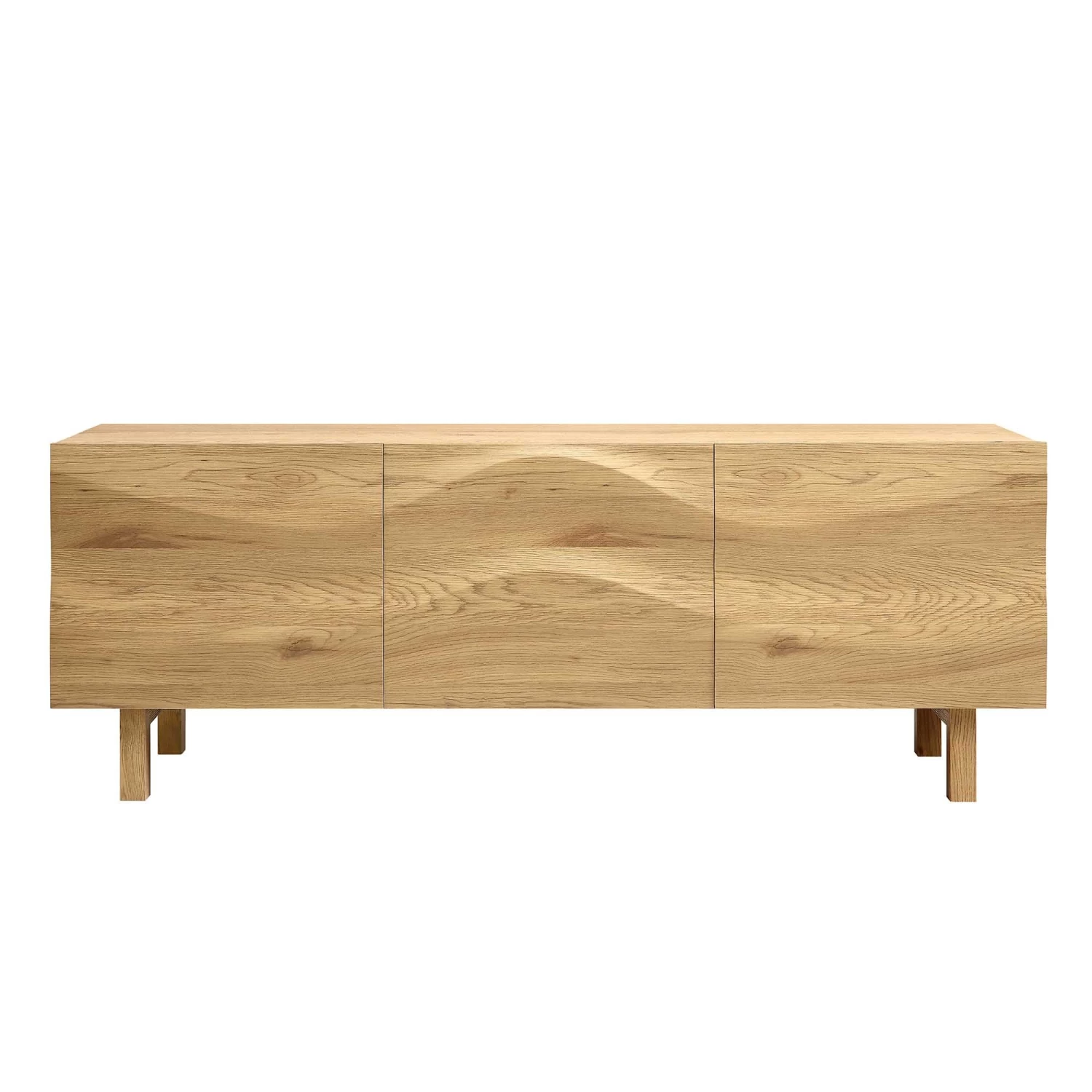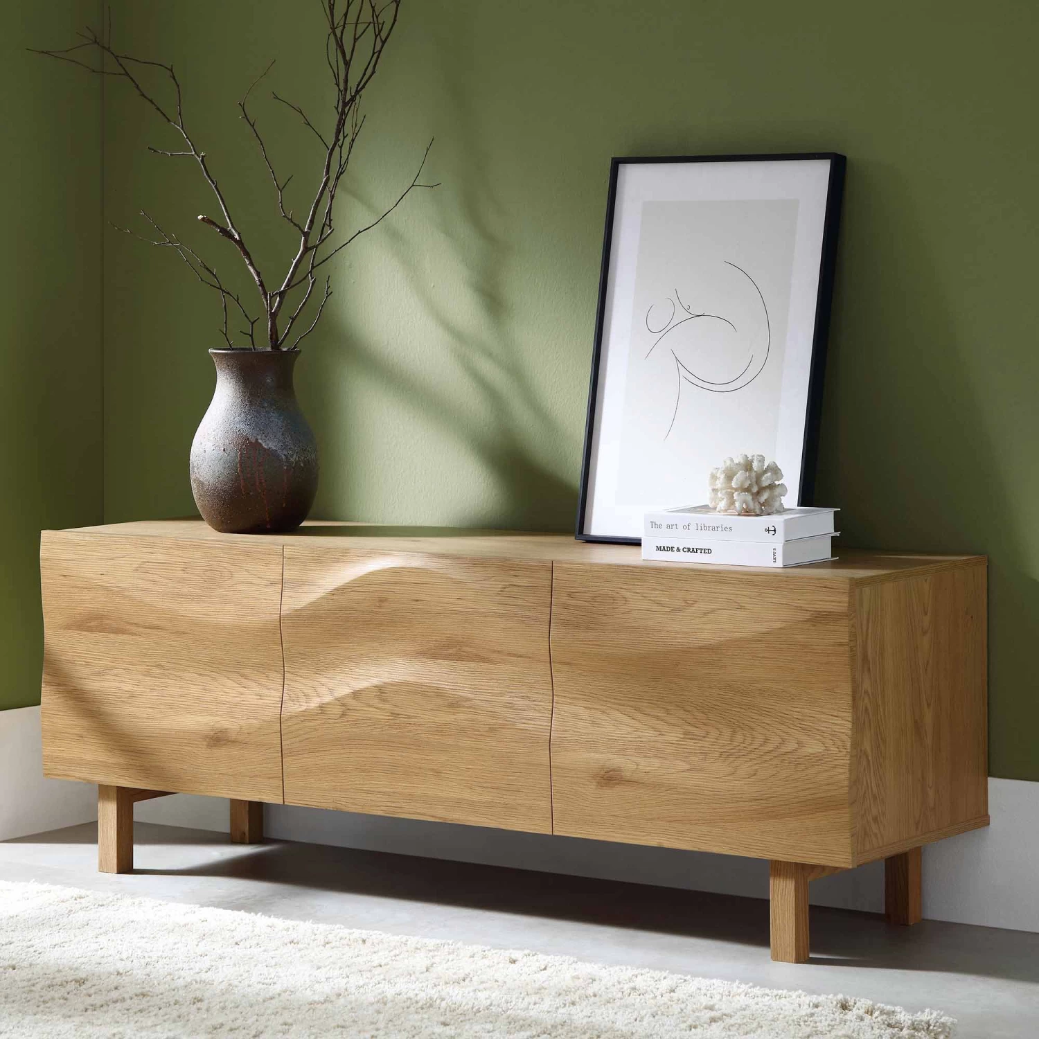 - The unique sculptural facade features flowing waves across entire width of the TV unit, cleverly concealing the three doors.
