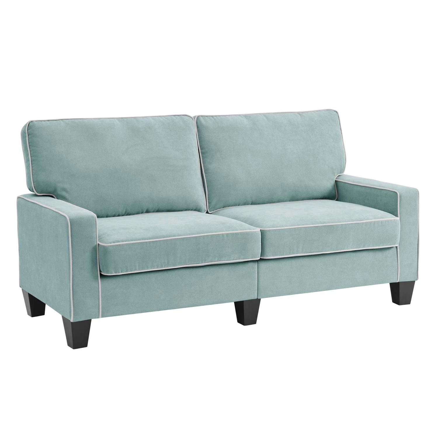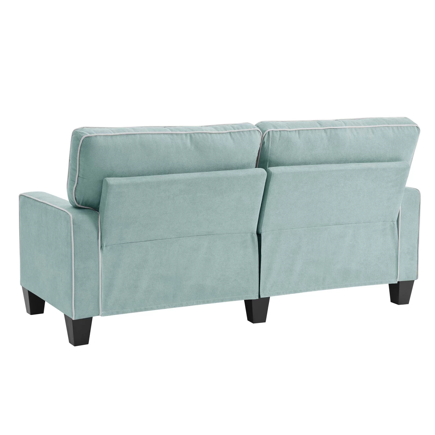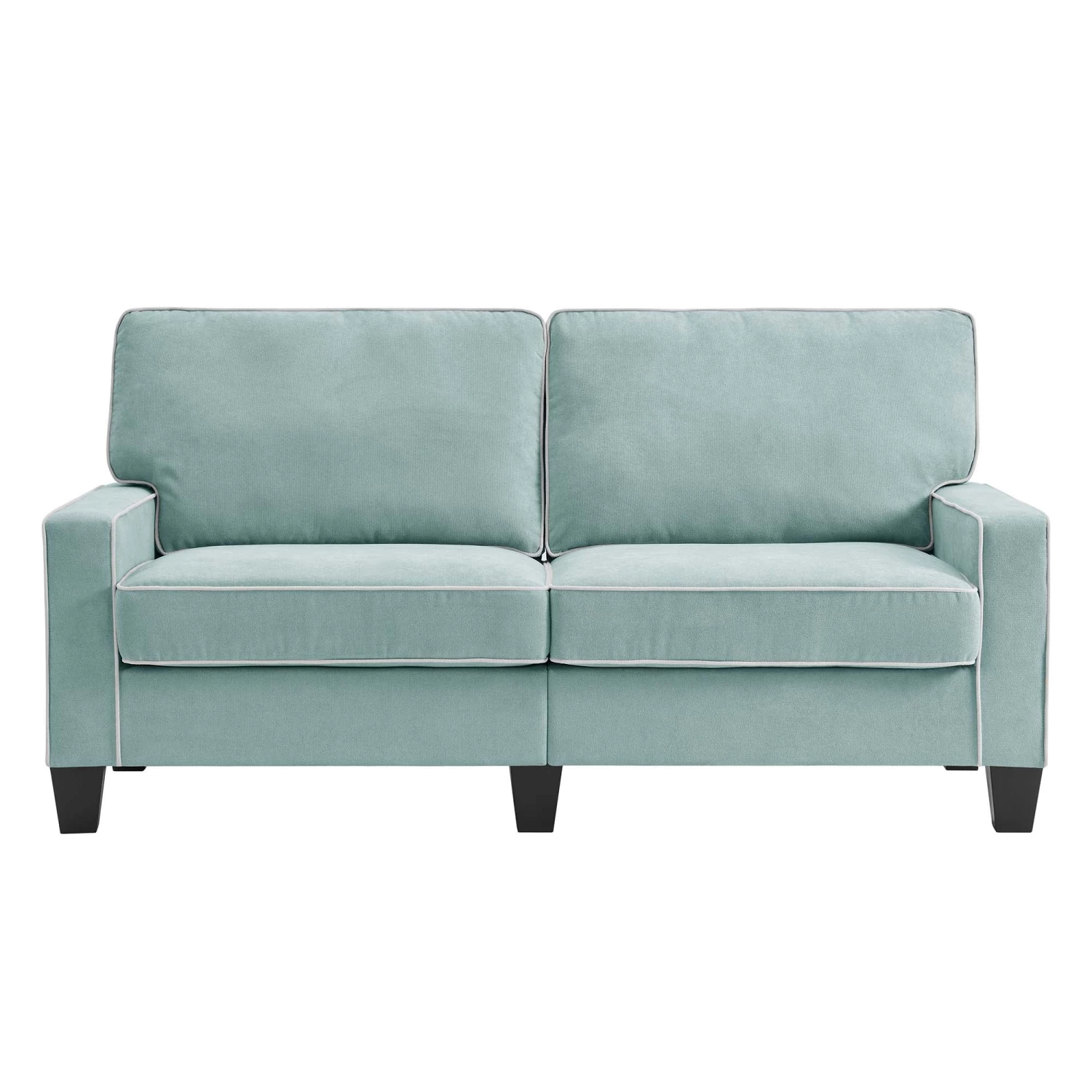 - Upholstered in cosy brushed fabric in refreshing mint colour, this sofa will brighten up any cosy home decor. Contrasting white piping complements the elegant silhouette of the sofa.